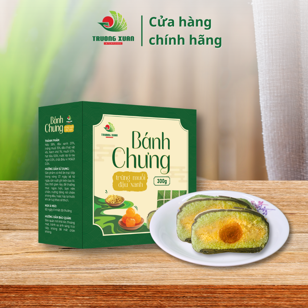 Bánh chưng trứng muối đậu xanh là biến tấu độc đáo của bánh chưng truyền thống, có hình vuông gói trong lá dong xanh, buộc lạt gọn đẹp. Khi cắt ra, lớp nếp dẻo thơm bao bọc nhân đậu xanh mịn bùi, điểm giữa là lòng đỏ trứng muối vàng óng, mặn béo hài hòa. Bánh tỏa hương nếp quyện lá dong đặc trưng, vị béo bùi xen chút mặn nhẹ, mang lại trải nghiệm vừa quen vừa mới, thích hợp cho mâm cỗ Tết, tiệc sum họp hoặc làm quà biếu sang trọng.