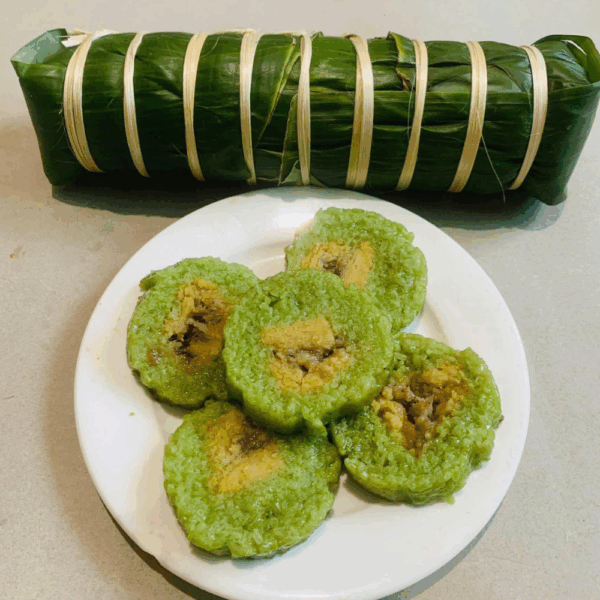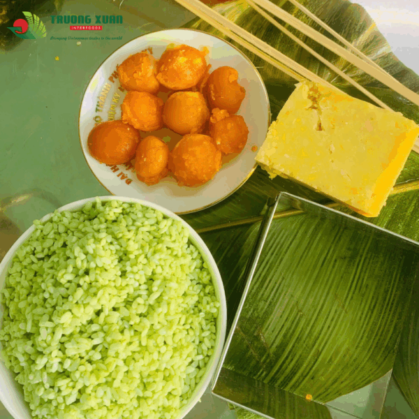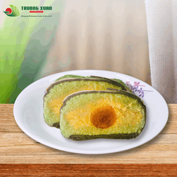 Bánh chưng trứng muối đậu xanh là biến tấu độc đáo của bánh chưng truyền thống, có hình vuông gói trong lá dong xanh, buộc lạt gọn đẹp. Khi cắt ra, lớp nếp dẻo thơm bao bọc nhân đậu xanh mịn bùi, điểm giữa là lòng đỏ trứng muối vàng óng, mặn béo hài hòa. Bánh tỏa hương nếp quyện lá dong đặc trưng, vị béo bùi xen chút mặn nhẹ, mang lại trải nghiệm vừa quen vừa mới, thích hợp cho mâm cỗ Tết, tiệc sum họp hoặc làm quà biếu sang trọng.